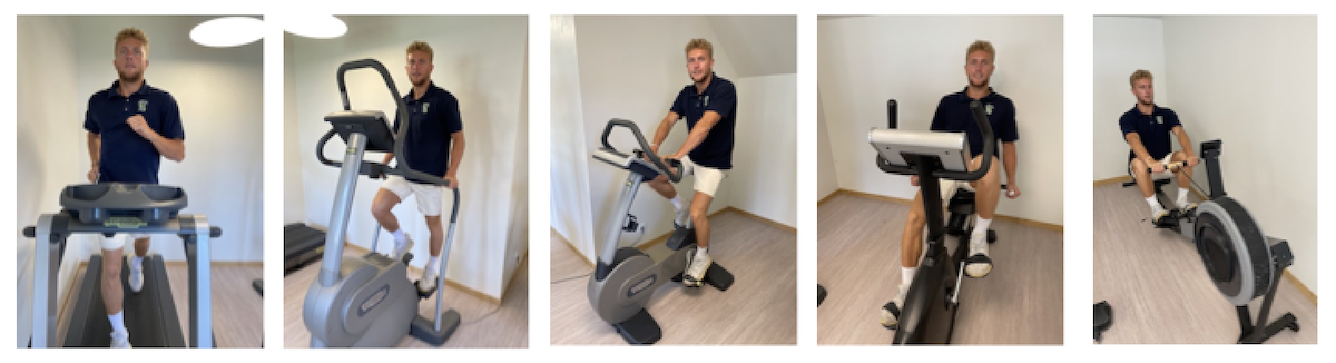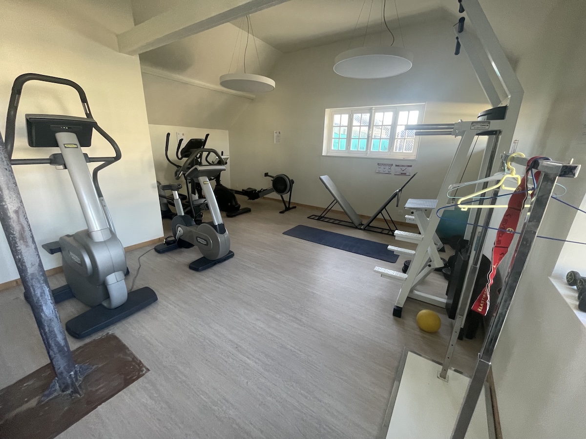 Les machines de cardio-training et de musculation sont opérationnelles, avec un vélo droit auto alimenté, un vélo semi-allongé, un vélo elliptique, un tapis de course, un rameur, une station de musculation avec traction assistée, une planche d’étirements et des haltères.